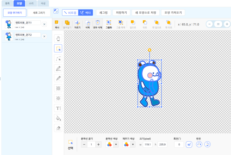 - 모양 탭 메뉴 : 오브젝트의 모양을 추가, 복제, 수정, 삭제 있으며, 저장 또는 원하는 이름으로도 변경하실 수 있습니다.