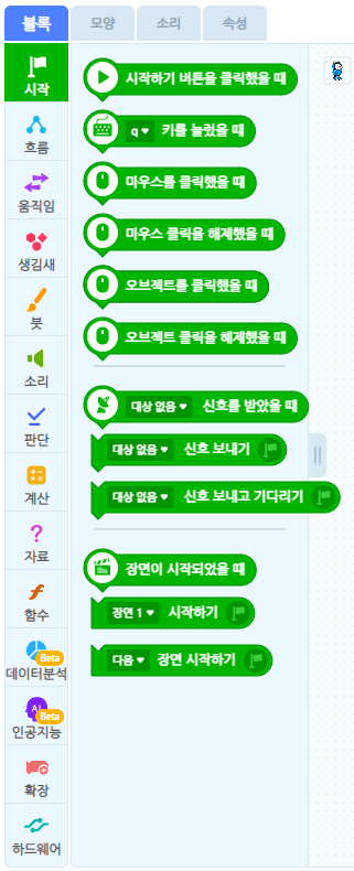 - 시작, 흐름, 움직임, 생김새, 붓, 소리, 판단, 계산, 자료, 함수, 데이터분석, 인공지능, 확장, 하드웨어 블록들이 있습니다.