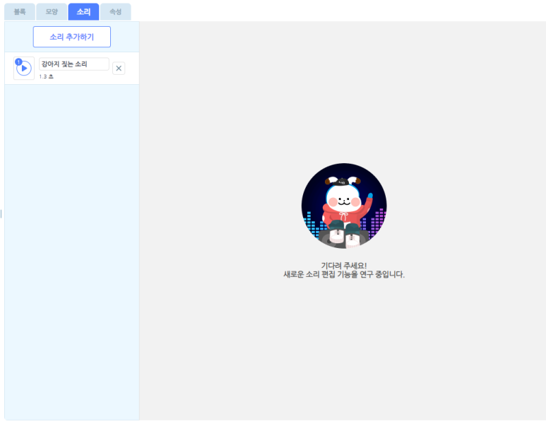 - 소리 탭 메뉴 : 오브젝트에 소리를 추가하거나 삭제를 하실 수 있습니다.