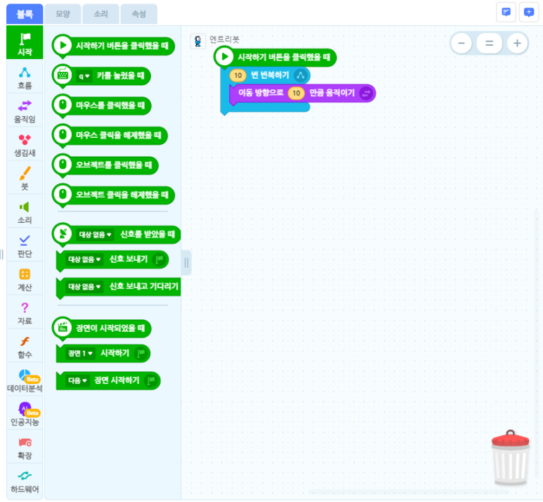 - 쓰레기통 아이콘은 블록 코딩 영역에 블록을 드래그 하여 삭제하실 수 있습니다.