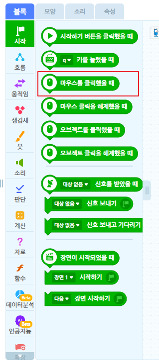 마우스 클릭 코딩 블록은 마우스 버튼을 클릭했을때 다음 코딩 블록을 시작합니다.