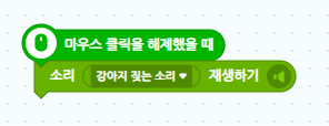 위 샘플은 마우스 클릭을 해제 했을때 강아지 짖는 소리를 재생하라는 블록 코딩입니다.