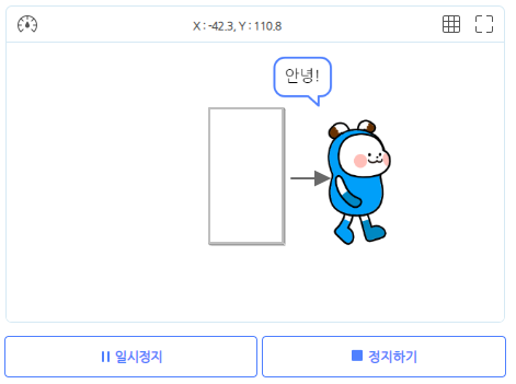 - 위와 같이 엔트리봇이 10번 반복하면서 10만큼씩 이동 후 [안녕!]이라고 말합니다.