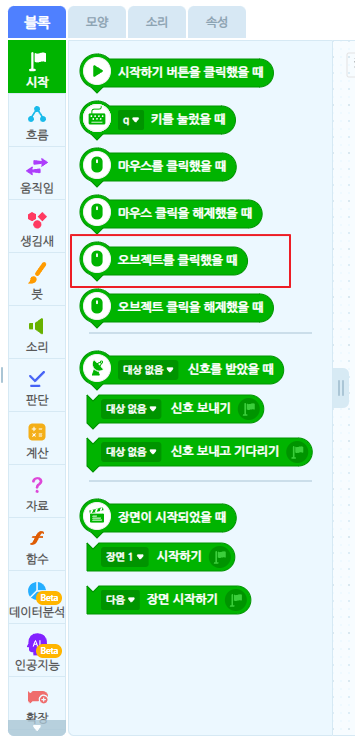 - 위 블록은 오브젝트를 클릭했을때 다음 블록을 실행하라는 뜻입니다.