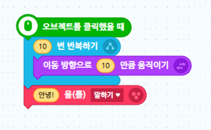 실행화면에서 오브젝트(엔트리봇)를 클릭했을때 10번 반복하면서 미리정해진 방향으로 10만큼 움직이고