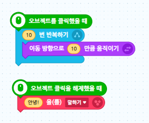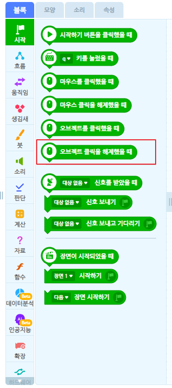 - 위 블록은 오브젝트를 클릭을 해제 했을때 다음 블록코딩을 실행하라는 뜻입니다.