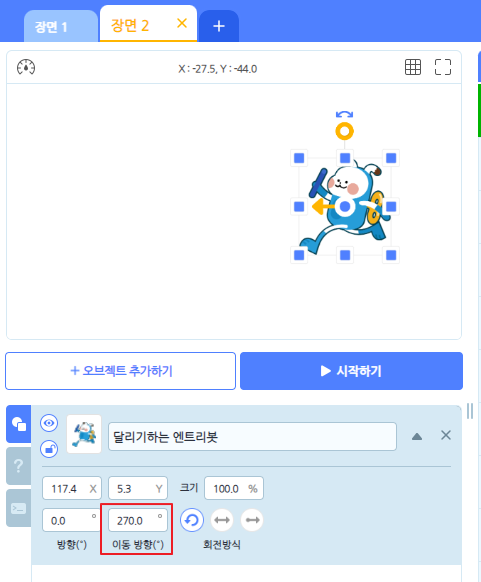 위와 같이 장면2에 엔트리봇이 뛰는 모습의 오브젝트가 추가됩니다.