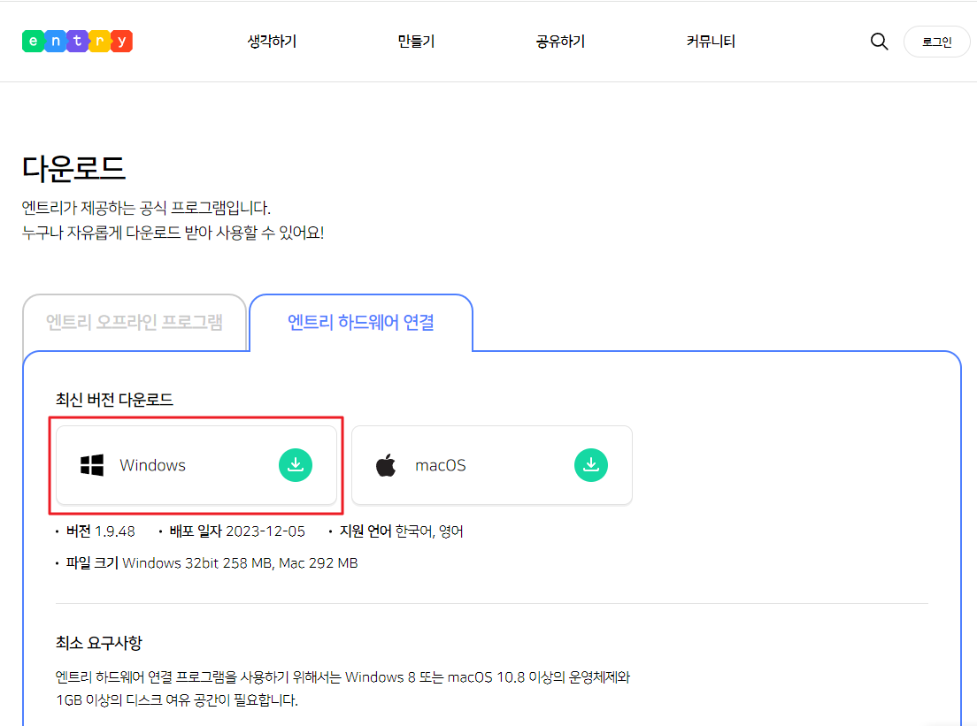 엔트리 하드웨어 연결 프로그램 죄소 요구사항은 Windows 8 또는 MacOS 10.8 이상의 운영체제와