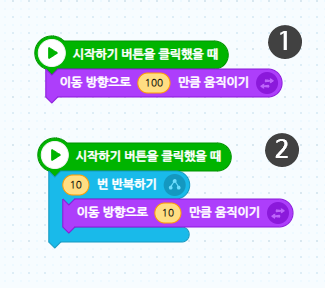 시작하기 버튼을 클릭했을때 오브젝트가 10번 반복하면서 이동 방향으로 10만큼 움직입니다.