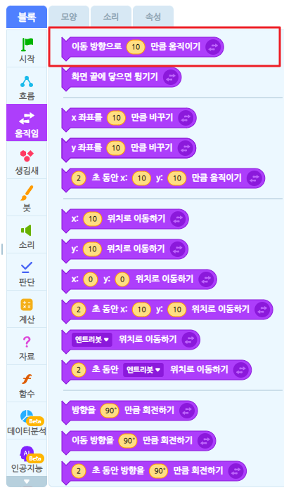 이번 강좌는 움직임 메뉴에 이동 방향으로 N만큼 움직이기 블록입니다.