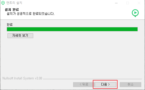 설치가 완료되면 다음 버튼을 클릭합니다.