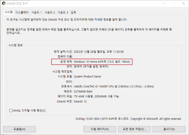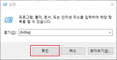 윈도우 실행에서 dxdiag를 입력하고 확인 버튼을 누르면