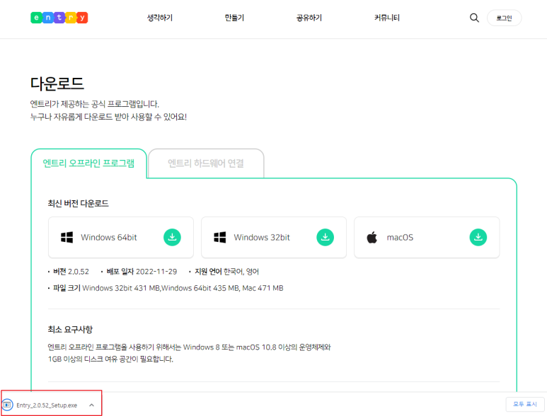엔트리 오프라인 프로그램 다운로드 페이지에서 본인 PC에 맞는 엔트리 프로그램을 다운로드 합니다.