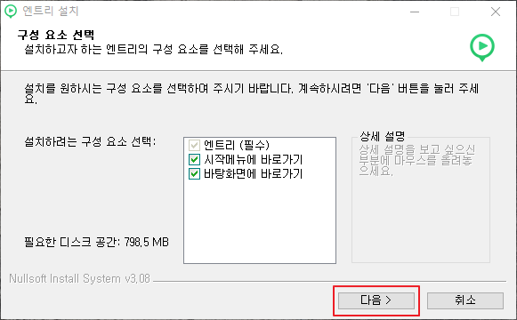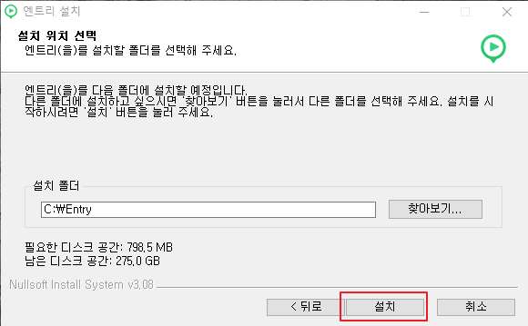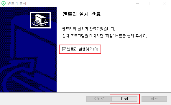 엔트리 실행하기가 체크 되어 있는지를 확인하고 마침 버튼을 클릭합니다.