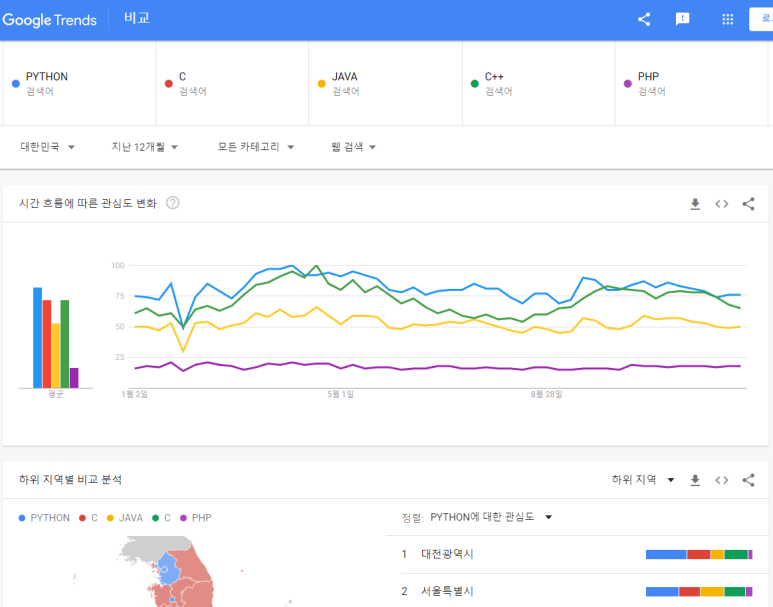 구글 트렌드로 파이썬이 우리나라에도 얼마나 인기가 많은지 잠시 살펴보겠습니다.