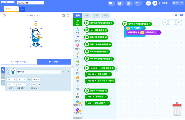 * 되돌리기 : 방금 실행했던 블록코딩을 다시 뒤로 되돌리는 기능.