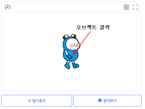 - 위 블록은 오브젝트를 마우스로 클릭했을때 다음 블록코딩을 실행하라는 뜻입니다.